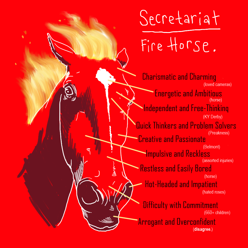 Secretariat is one of the most vibrant, dynamic, and passionate individual horses in the Sport of Kings. He stood out as a being of pure ambition, enthusiasm, and galloping. In the Chinese Zodiac, Fire signs are often associated with confidence and a love for being in the spotlight, and make no mistake — that’s exactly describing this incredible horse. A horse so inspirational that we canonized him in our own religion.