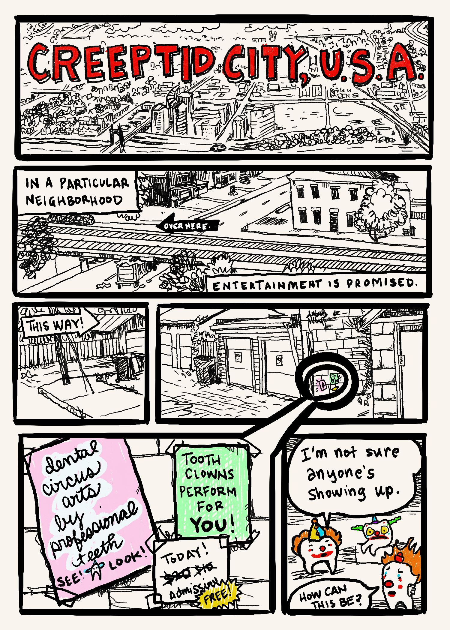 I only got to make two comics along this theme (and six in total) before I found creeptid dot com to be no longer up and I had to ask what happened to it. But what will the story of the Teeths Clown be? Where will they go? Can they survive as a troupe of very talented entertainers? What of this Hans Strongtooth and what of the World’s Fattest Tooth??